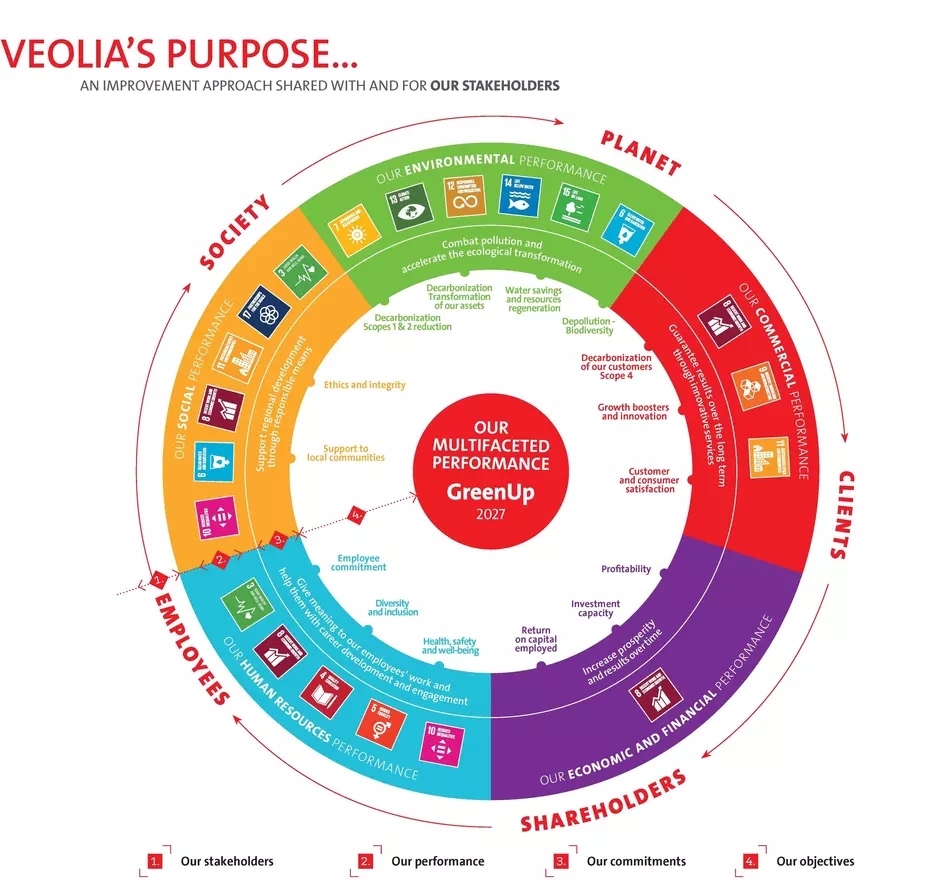 To be useful to all its stakeholders, Veolia has incorporated environmental, social and governance(ESG) objectives and indicators at the heart of the company’s operation. This is what Veolia refers to as “multifaceted performance. The multifaceted performance wheel represents our balanced commitments and impact between: